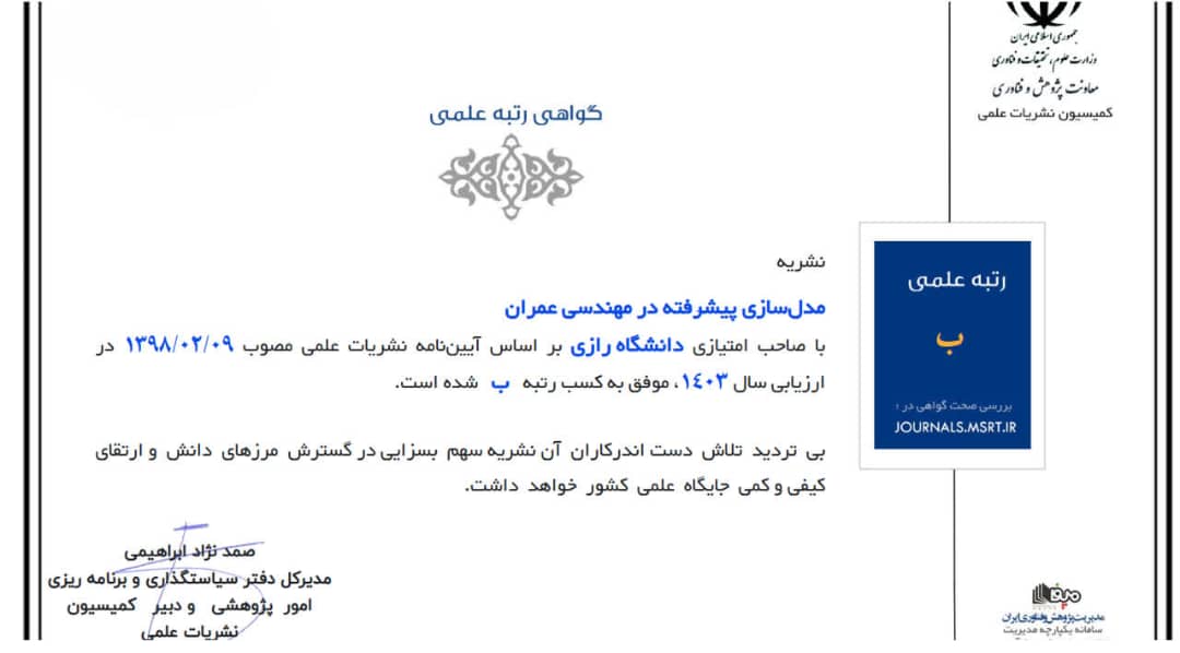 گواهی رتبه علمی (مدلسازی پیشرفته در مهندسی عمران)